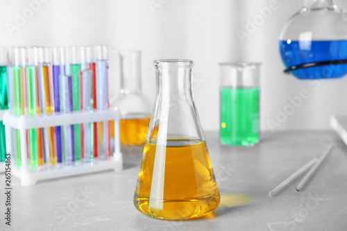 Laboratory glassware with samples on table indoors. Solution chemistry
