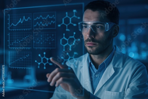 Laboratory researcher in safety glasses analyzing data on transparent holographic screen