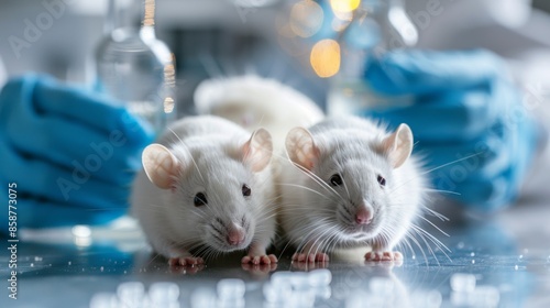 laboratory white rats on a table in the laboratory, in the background the gloved hands of a scientist performing experiments, conducting research