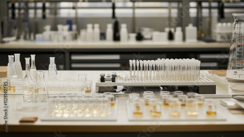 Laboratory Workspace with Various Glassware and Chemical Solutions in a Modern Research Facility Showcasing the Scientific Process and Experimentation