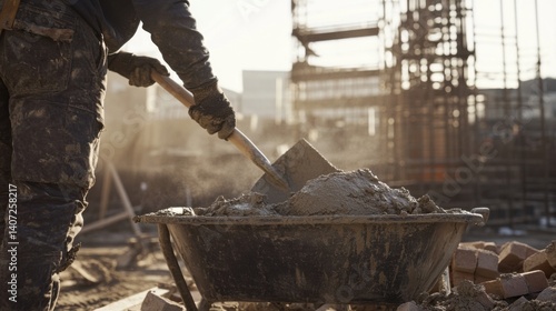 Laborer mixing mortar for bricklaying. Featuring material preparation and masonry
