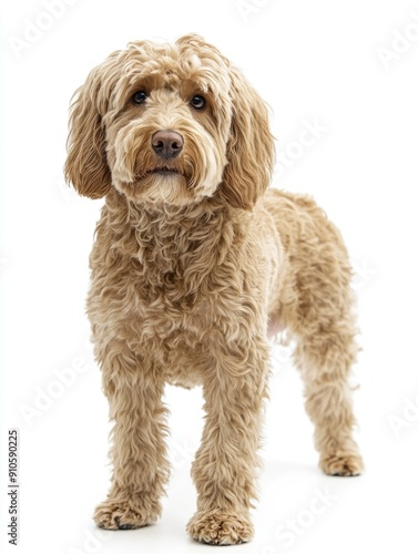 labradoodle dog standing, isolated on white background