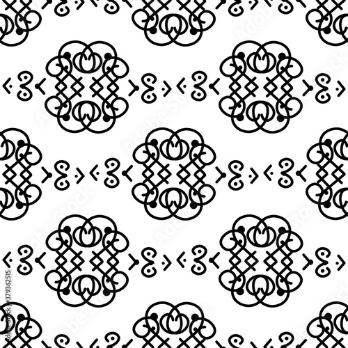 Lace seamless pattern of geometric black calligraphic curls, ornaments on a white background. Vintage prints. Stock vector illustration for decor and design, wallpaper, wrapping paper, fabric.