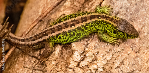 Lacerta agilis, sand lizard, on a sunny summer day near Landau, Isar, Bavaria, Germany