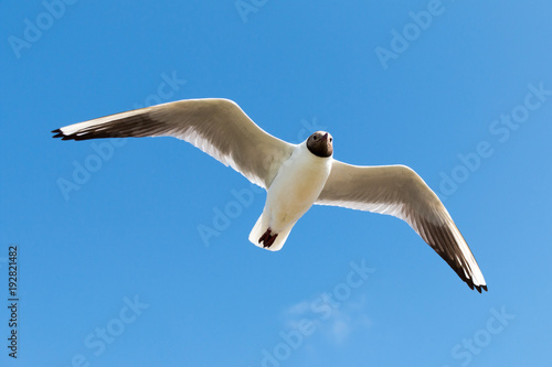 Lachmöwe Nahaufnahme fliegend am blauen, sonnigem Himmel