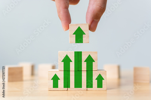 Ladder career path for business growth success process concept. Wood block stacking as step stair with arrow up. Hand putting wooden cube block on top pyramid