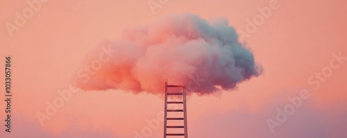 Ladder reaching into a pink cloud, dreamlike scene. Surreal imagination and creativity concept