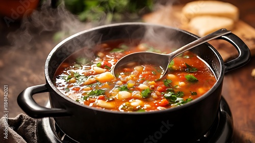Ladle serving delicious soup from a pot with steam rising in a warm kitchen
