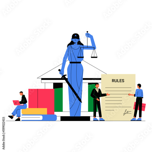 Lady Justice With Sword And Scale In Front Of Courthouse In Flat Vector Illustration Symbolizing Law, Order, And Fairness, Isolated On White Background.