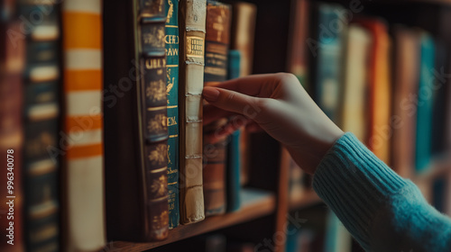 Lady selects a classic book from a shelf filled with old volumes in a library