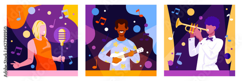 Lady singing song in microphone on party. American male holding ukulele and playing song. Stylish musician playing on trumpet. Concept of creating music. Flat vector illustration in cartoon style