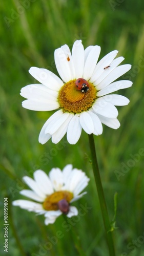 ladybug insect on chamomile flower close-up, blooming chamomile macro
