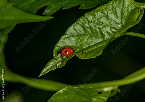 ladybug looking for nectar on a green leaf