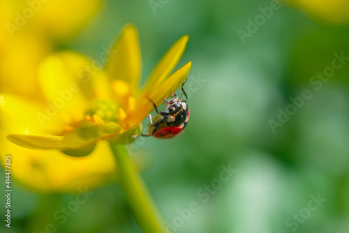 Ladybug on the Blooming yellow crocus flower in the spring forest. First spring flowers close-up. Nature background.