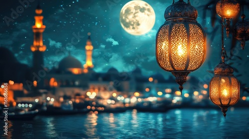 Lailat al-Miraj celebration - a vibrant banner marking significance of sacred night, adorned rich symbols, colors, Islamic motifs, reflecting spiritual journey, divine ascension of Prophet Muhammad.