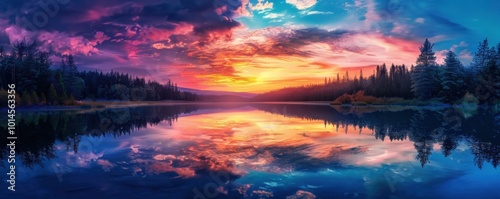 Lake at dusk with a vibrant sky and still water, 4K hyperrealistic photo,