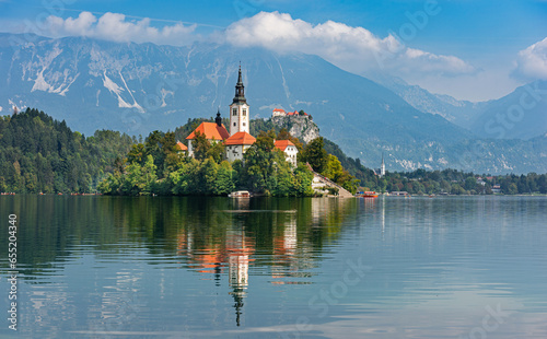 Lake Bled (Blejsko jezero) Slovenia. Beautiful mountain lake with small Pilgrimage Church. Most famous Slovenian lake and island Bled with Pilgrimage Church of the Assumption of Maria and Bled Castle