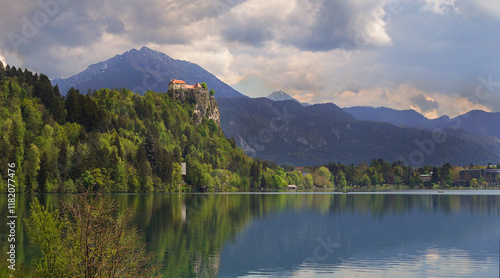 Lake Bled in Slovenia with its castle and surrounding mountains.