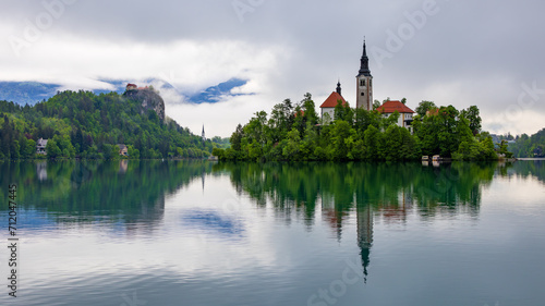 Lake Bled Slovenia with the small island in the middle of the lake and the old church.