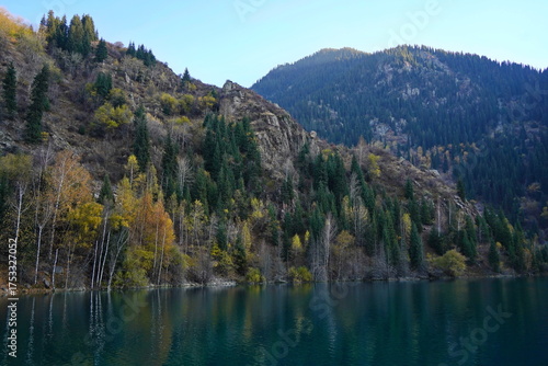 Lake Issyk in the rays of the setting sun. National Nature Park. Mountainous area with different vegetation.