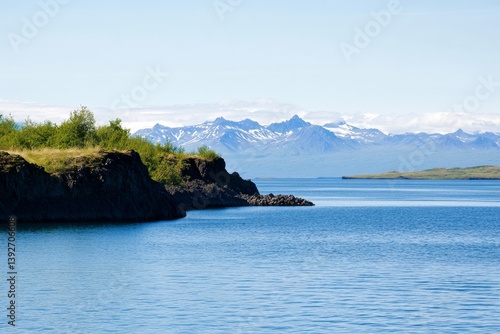 Lake scene with rocky shores, grass, and distant snow-capped mountains