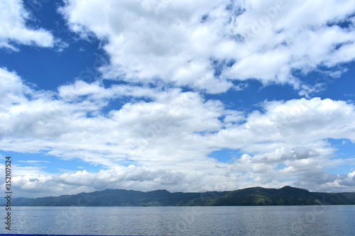Lake Toba view with blue sky. A large natural lake in Sumatra, Indonesia, occupying the caldera of a supervolcano.