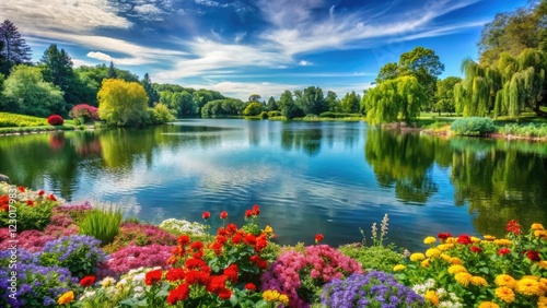 Lake with lush greenery and colorful flowers surrounding its shore, greenery, serene