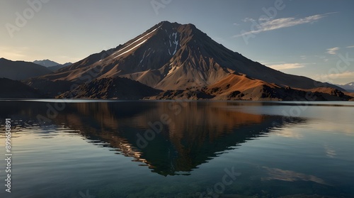 Lake with tranquil waters reflecting the early light off of a volcanic peak.