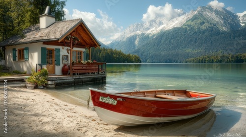 Lakeside Cabin and Red Rowboat in a Mountain Setting