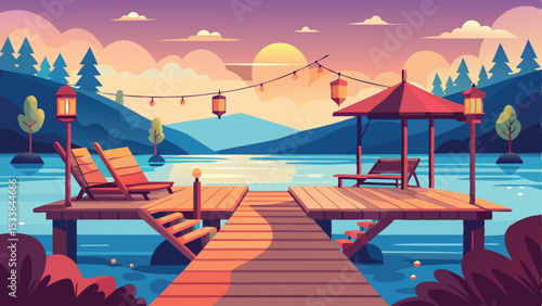 Lakeside pier sunset scene with lounge chairs and lanterns illustration