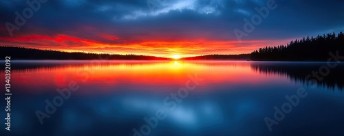 Lakeside sunset landscapes idea. A breathtaking sunset illuminating a serene lake surrounded by lush greenery.