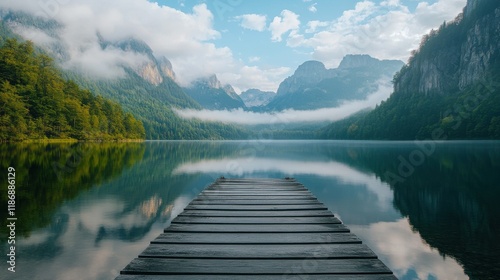Lakeside view with wooden dock and towering peaks under fluffy clouds