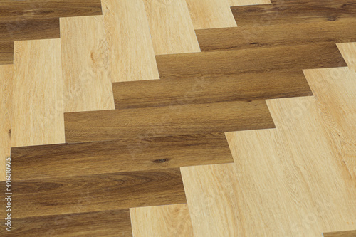 Laminate and parquet with herringbone background. Wooden floor with a chevron pattern in the living room of the designer interior