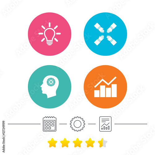 Lamp idea and head with gear icons. Graph chart diagram sign. Teamwork symbol. Calendar, cogwheel and report linear icons. Star vote ranking. Vector