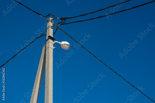 Lamppost, lamp with energy-saving lamp on top, electrical wires, against a blue sky