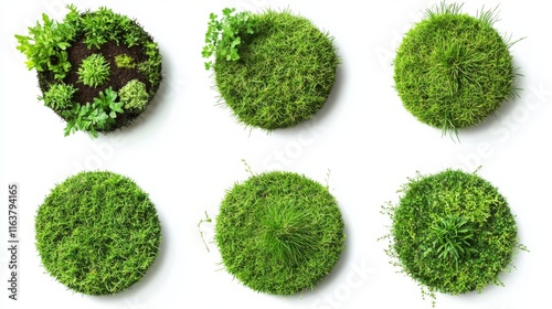 Land pieces with green grass realistic vector illustration. Trimmed round and square park or garden plots with soil and plants, perspective view isolated on white background