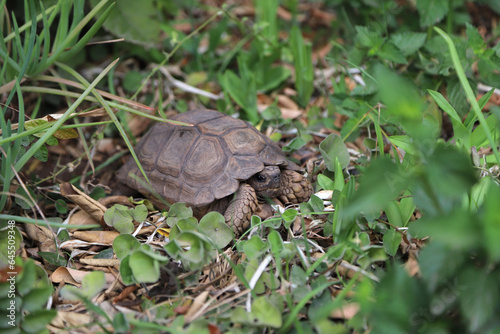 Land tortoise of the species Chelonoidis chilensis in the garden of a house. Species of Argentine tortoise that is in danger of extinction. Chelonian reptile. Turtle shell and body in brown colors.