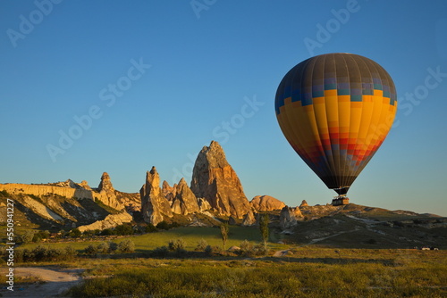 Landing of a hot-air balloon at Cavusin,Cappadocia,Nevsehir Province,Turkey