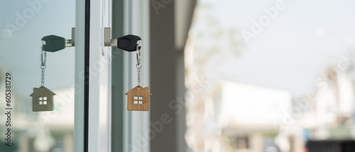 Landlord key for unlocking house is plugged into the door. Second hand house for rent and sale. keychain is blowing in the wind. mortgage for new home, buy, sell, renovate, investment, owner, estate