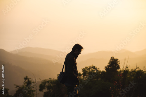 landscape and travel concept with man see sunrise and layer of mountain and mist with forest on morning