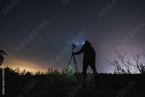 Landscape astrophotographer with a camera on a tripod outdoors in early spring at night under the starry sky.