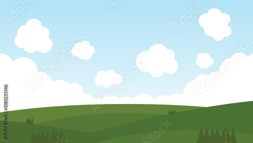 landscape cartoon scene. green filed with grass and white fluffy cloud on blue sky background