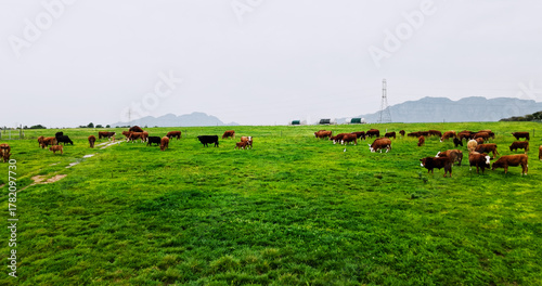 Landscape, environment and cow in countryside for agriculture, eating and livestock for sustainable dairy. Space, conservation and animal on farm for production, meat or milk industry on cattle ranch