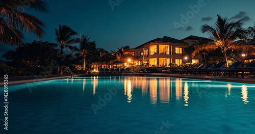 Landscape of a luxury hotel with a swimming pool in Miami Beach, Florida at night. Luxury beach resort and vacation concept. Stock photo with 2/3 of the image reserved for text placement, such as All