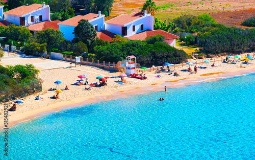 Landscape of Chia Beach and Blue Waters of the Mediterranean Sea in Province of Cagliari in South Sardinia in Italy. Scenery and nature. Mixed media.