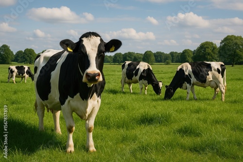 Landscape of grazing cattle in a grassy field with dairy farming elements