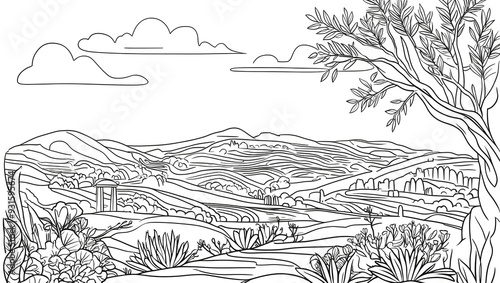 Landscape of Greece with hills, trees, clouds. Colouring book page outline, line art drawing