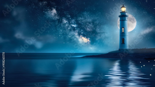 Landscape of lighthouse tower at night, on sea or ocean blue water shore coast under starry sky. Beautiful evening dark, beacon navigation, nautical safety, illuminated bay