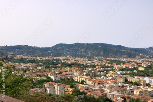 Landscape of Sorrento, Naples, Italy, West Europe. View of village on the shore cliff. Mediterranean Sea.