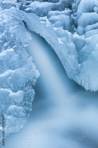 Landscape of winter waterfall framed by ice and captured with motion blur, Orangeville Creek, Michigan, USA